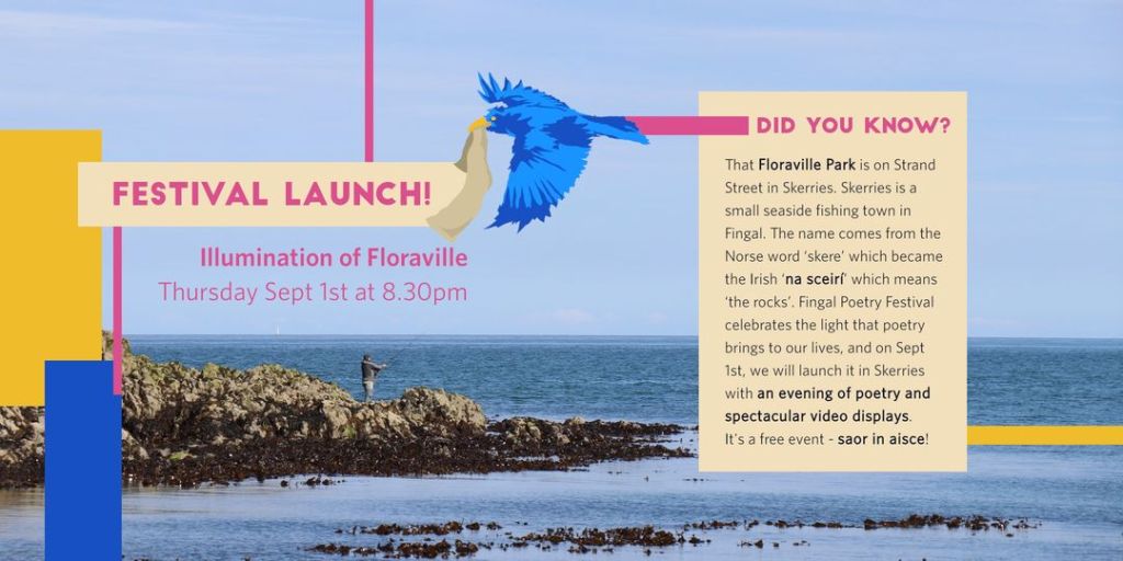 Indeed, do mark your diaries! On Thursday, September 1st, Fingal Poetry Festival will launch with an evening of poetry and spectacular video displays. We are celebrating the light that poetry brings to our lives and the sea – which is precious to all and in peril.