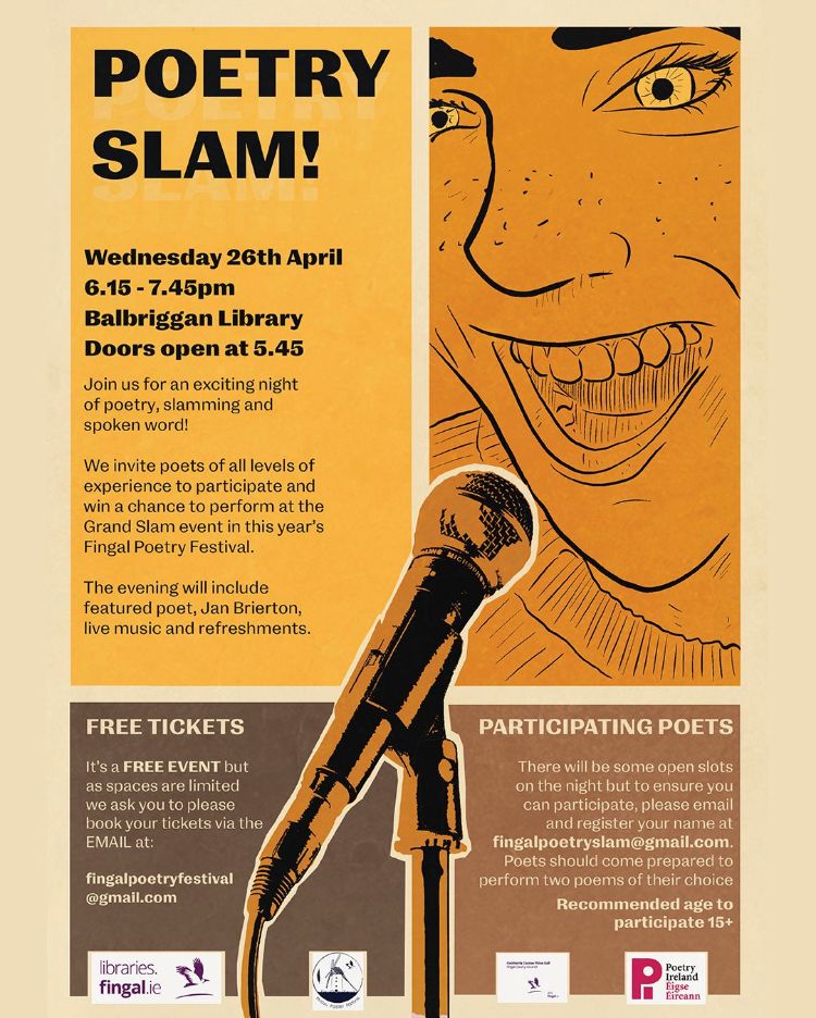 We are excited to announce that the Fingal Poetry Festival Slams are returning for 2023. The first one will take place in Balbriggan Library on Wednesday, 26th April.