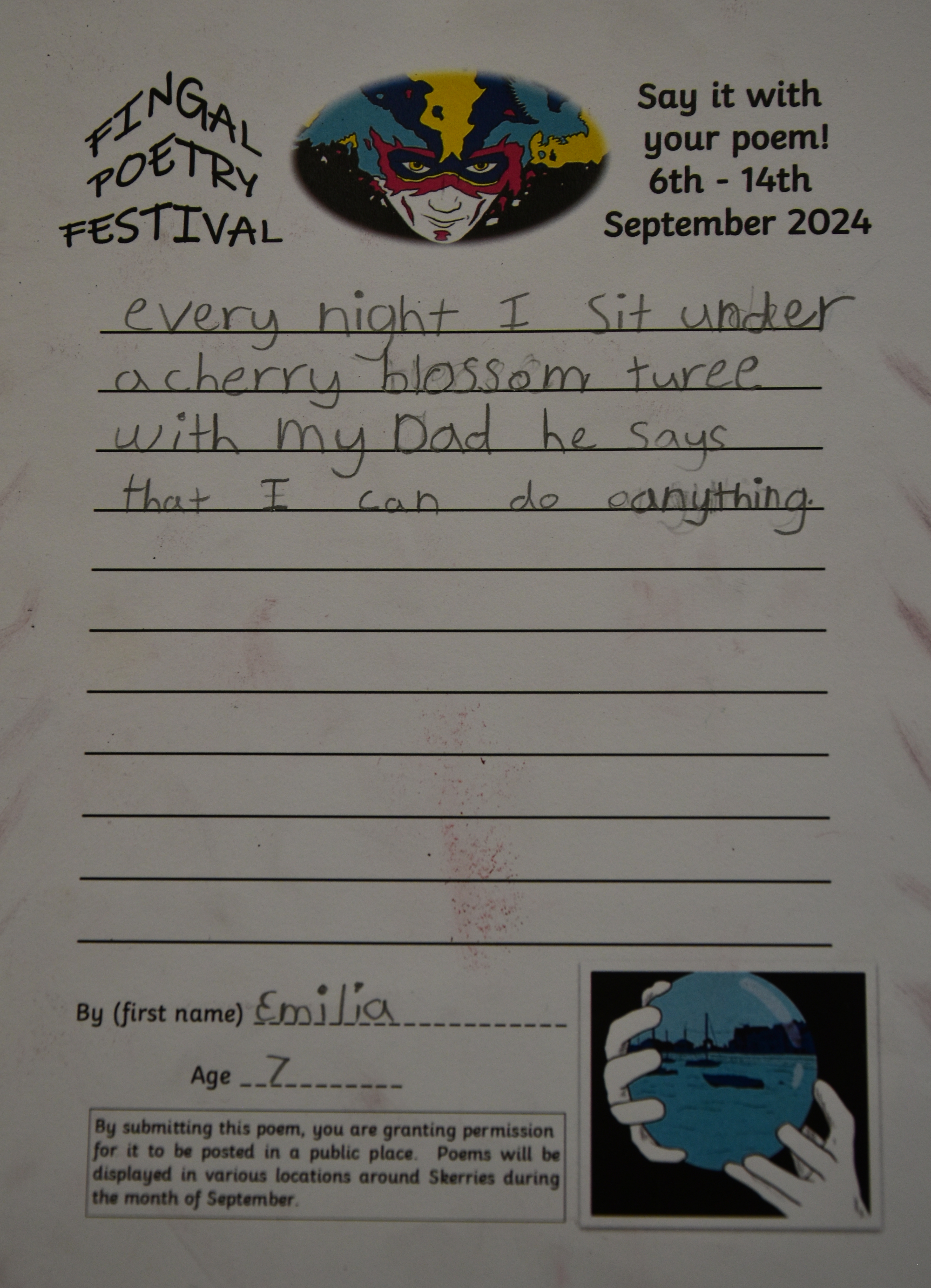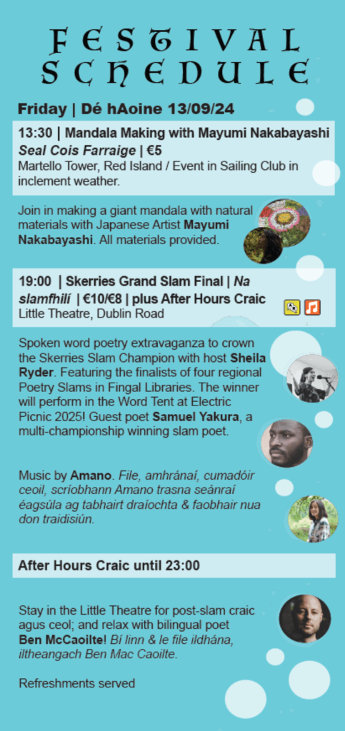 The festival events for the BIG POETRY DAY OUT / Lá Mór Filíochta were timed so that visitors could come to Skerries by train or bus, spend the day enjoying the Fingal Poetry Festival events all over town and leave after the last event of a fun and refreshing day, enveloped in sea air, poetry, music and art…