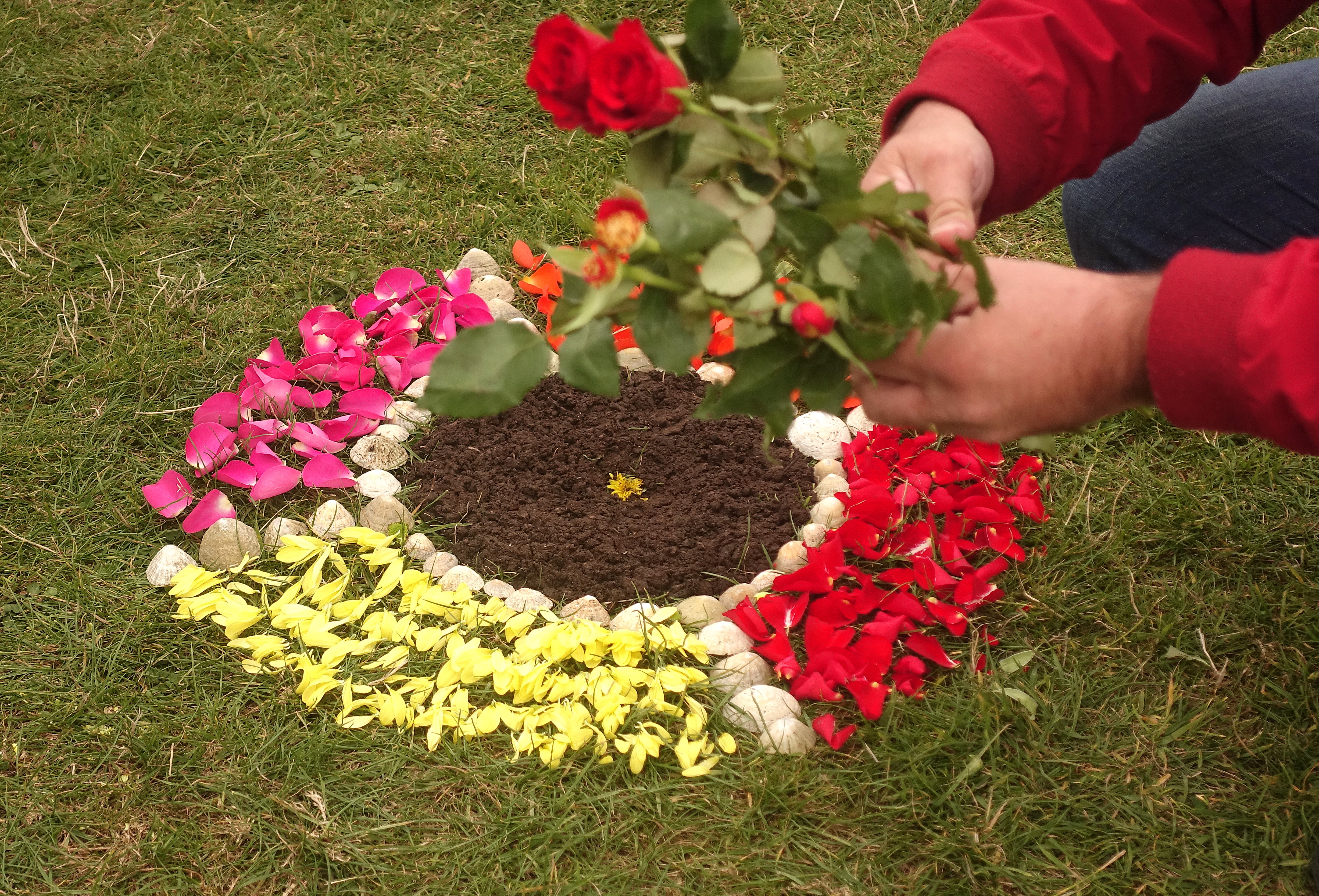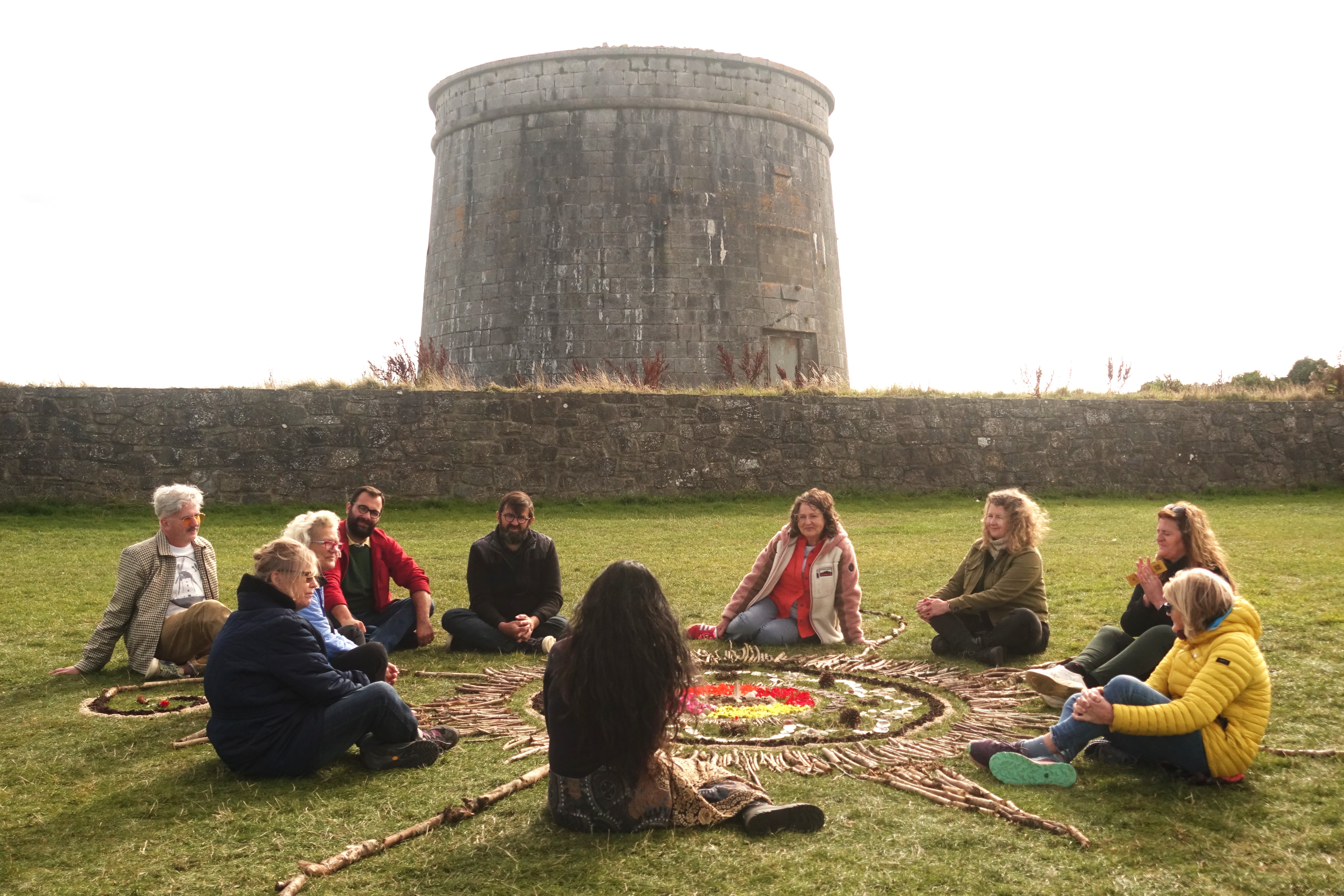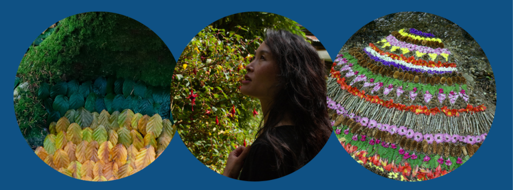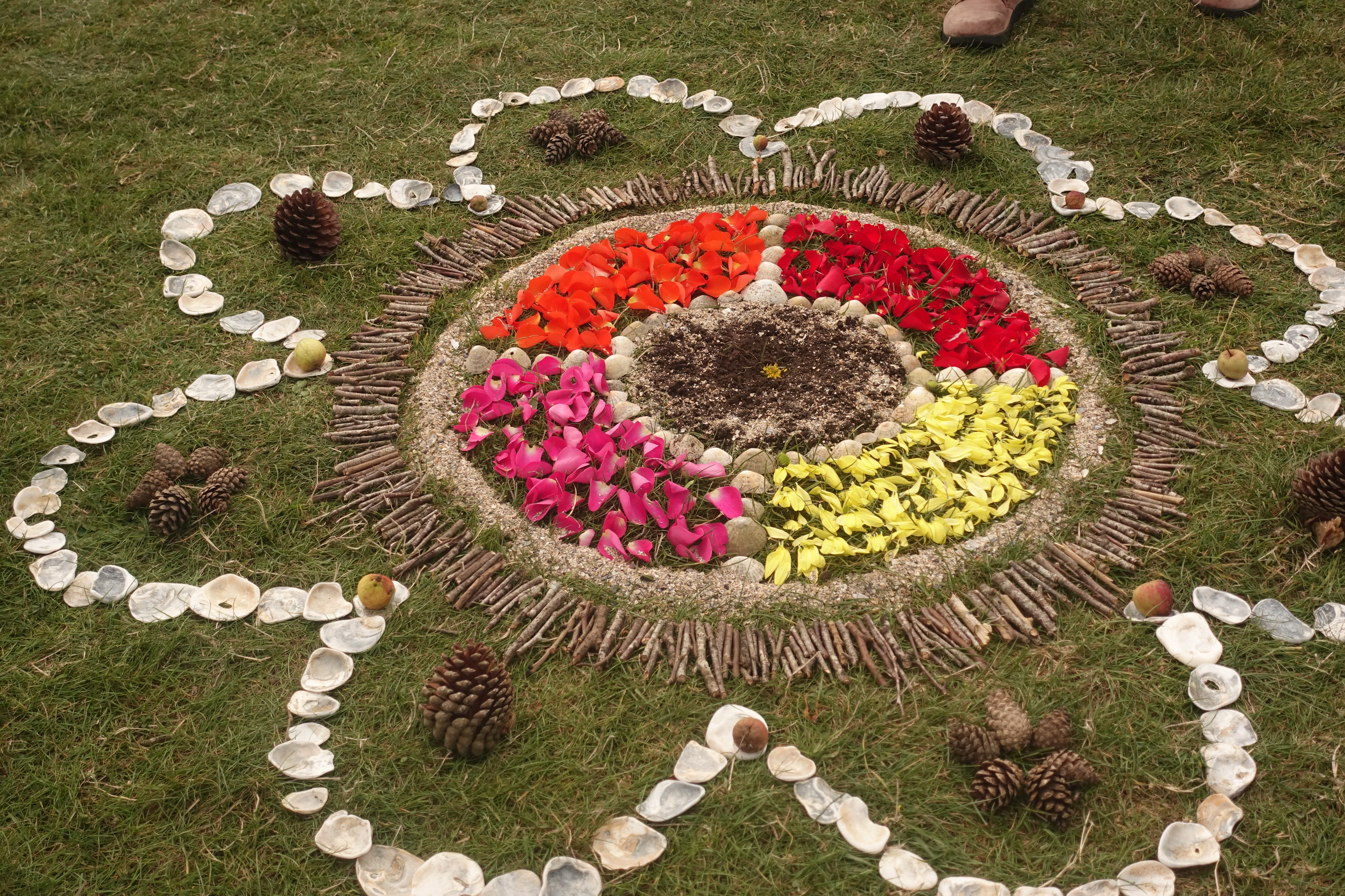 Mayumi, an amazing Japanese land artist, guided participants in co-creating a beautiful large-scale natural geometric shape using natural materials- flowers / leaves / shells / twigs, inspired by a poetry image. It was a truly mindful, creative and uplifting experience.
