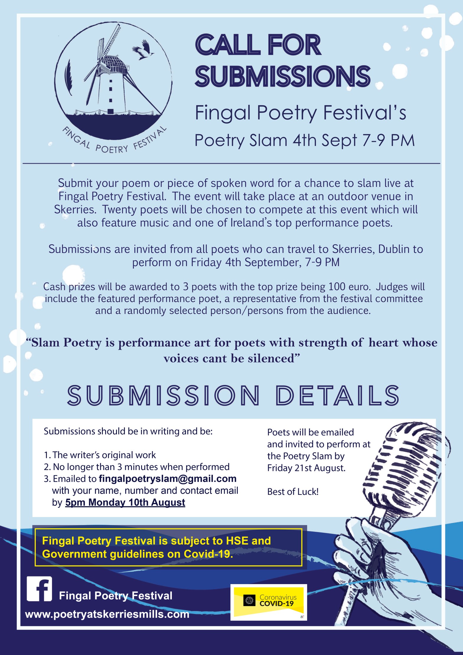 Skerries, Dublin. Friday 4th September, 7-9 pm. Submit your poem or piece of spoken word for a chance to slam live at Fingal’s Poetry Festival. Cash prizes will be awarded to 3 poets with the top prize being 100 Euro. Submissions are invited from all poets who can travel to Skerries, Dublin and perform onContinue reading “Fingal Poetry Festival’s Poetry Slam”
