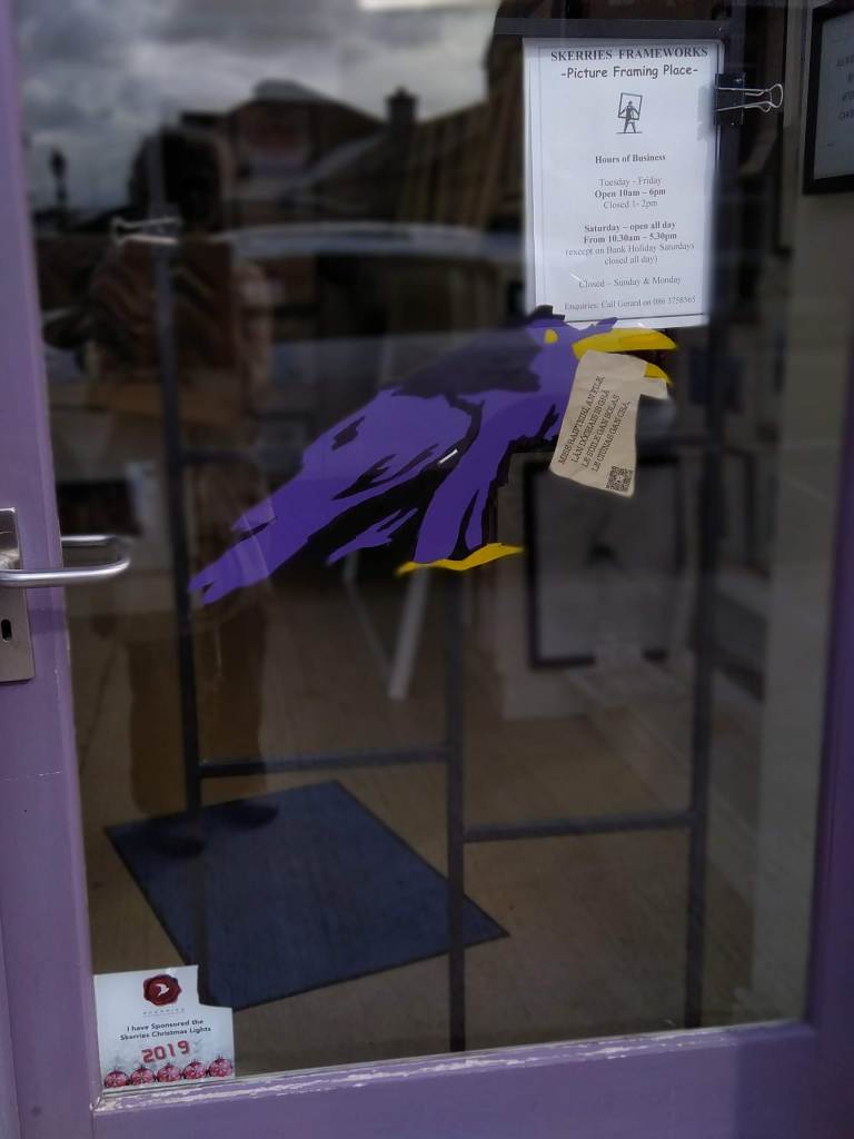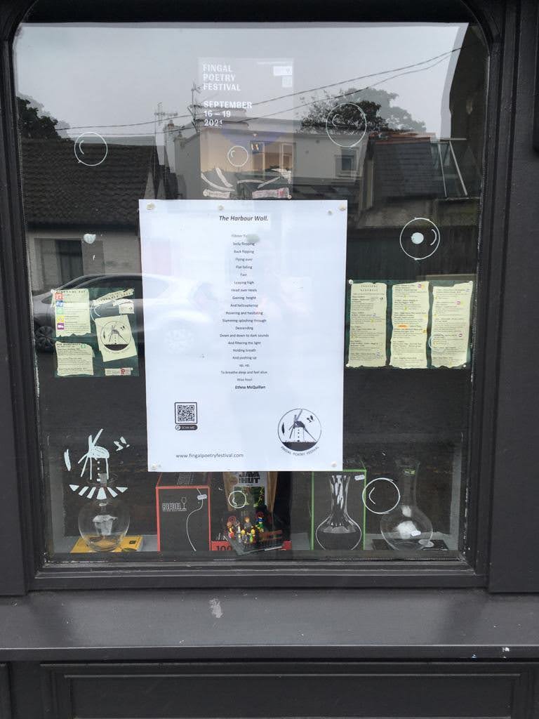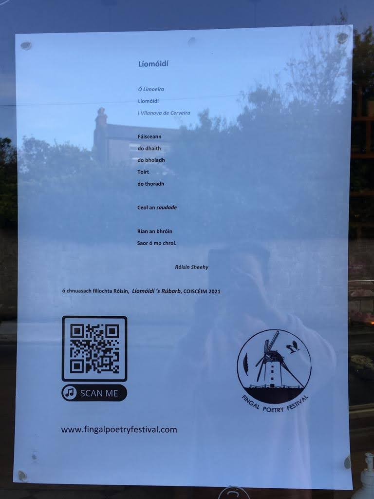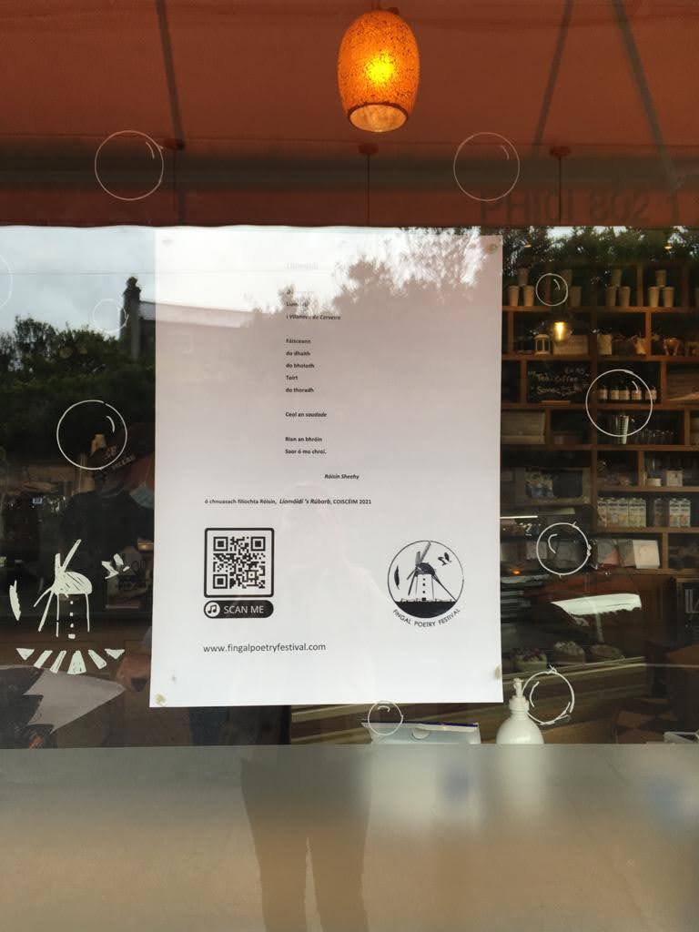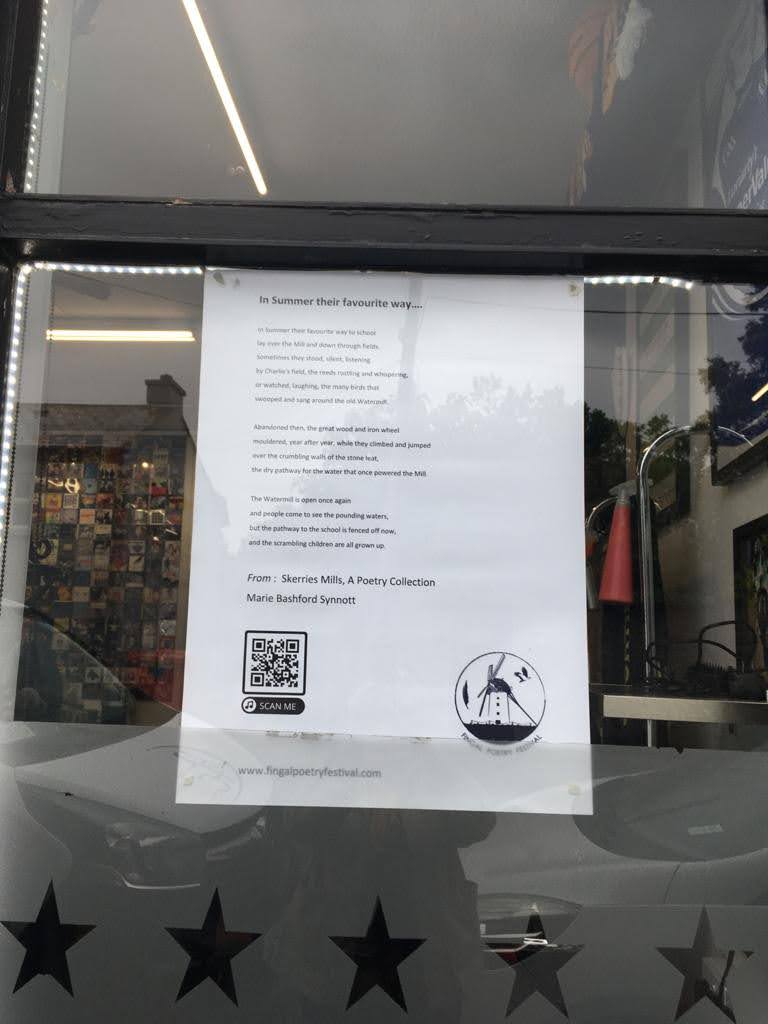Like these poems in shop windows around Skerries for two weeks leading up to the Festival. Some even have QR codes which enable people to listen to the poet talking about the displayed poem. Try it yourself!