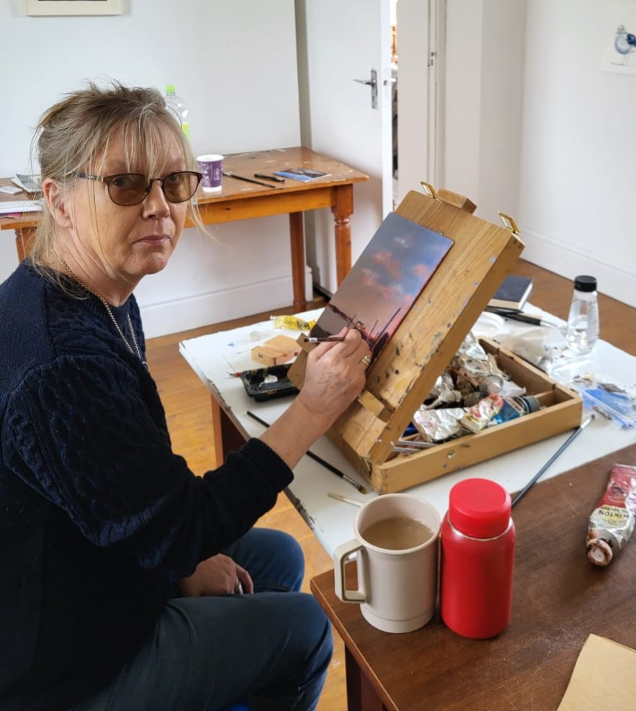 She works mainly in oil but also in watercolour, print, textile and batik. She is very inspired by my natural surroundings and a lot of her work is landscape, including plein air. She also loves still life painting and has recently started a series of small paintings of fruit and vegetables. She enjoys working on a small canvas and concentrating on detail.